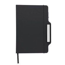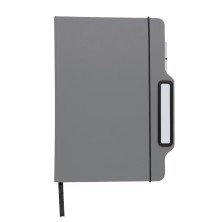 Bloc de notas soporte fabricado en suave PU. Con tapas rígidas,cuenta con soporte para smartphone en portada. Incluye bolígrafo de escritura eterna en color blanco. Con 80 hojas interiores lisas de color crema, elástico de cierre negro y marcapáginas a juego.
